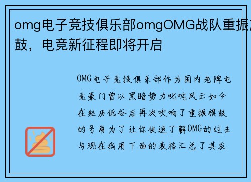 omg电子竞技俱乐部omgOMG战队重振旗鼓,电竞新征程即将开启
